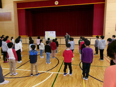 今日は毎月行っている朝会での子供たちの並び方について説明します。朝会時の並び方は職員駐車場側から5年生、3、4年生、1年生、2年生、6年生の順に並びます。ここまでは各担任が引率して体育館に来ますが、その後、全体で整列する際、両サイドの6年生、5年生の間隔に子供たち自身が調整して整列することになります。58人が、縦横にぴったり並ぶまでには、何回かの指示が必要となりますが、9月くらいから子供たち自身が考えて指示がなくてもできるようになってきました。ご覧ください。