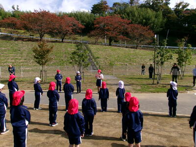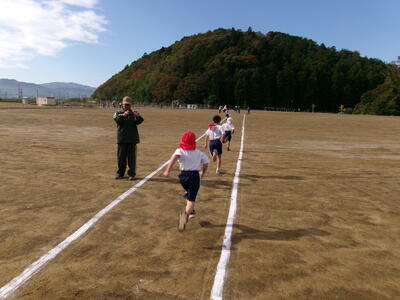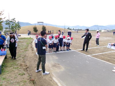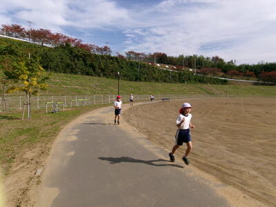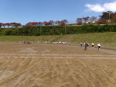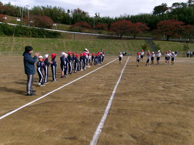 快晴の中、北上地区多目的グラウンドで持久走記録会を開催しました。参加した全員が最後まで走り切ることができたことがとてもうれしかったです。児童は、各学年での順位ではなく、自分の記録更新を目指し、休み時間なども練習に励んでいました。こども園さんからも応援していただきました。