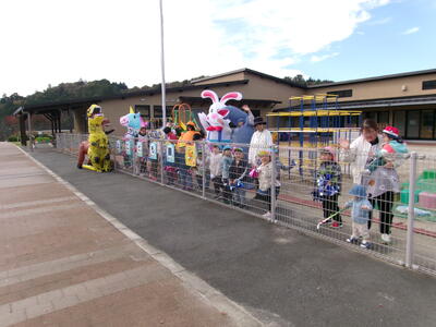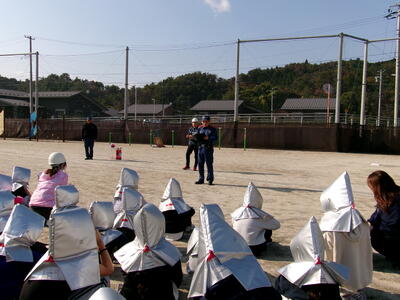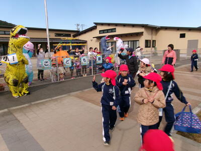 北上こども園の避難訓練の3次避難で、園児さんと職員さんが小学校に避難しにきました。強い風が吹く中でしたが、先生方の指示を聞いてしっかり歩いてきました。