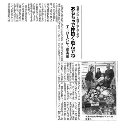 10月26日に行われた「にっこりまつり」の際に、ご家庭で不要になった子供用おもちゃ、文房具、子供服等を提供していただき石巻かほく商工会青年部の方々に販売してもらいました。あいにくの天気のため、児童が手伝うことができませんでしたが、商工会青年部の方にご協力いただき販売が行われました。得られた収益で、児童の活動で必要なものを今後購入していきたいと思います。ありがとうございました。残った子供用のおもちゃやぬいぐるみ等は、子どもや子育て世帯の支援活動に取り組むNPO法人「TEDIC(テディック)」さんに寄贈させてもらいました。その新聞記事(日日新聞)と寄贈したときの写真をご覧ください。