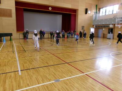 朝の活動でシャトルランリレーを行いました。しっかり準備体操で体をほぐし、たてわり班ごとに学年関係なく協力して走り切りました。教職員もまぜてもらいました。