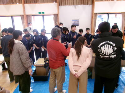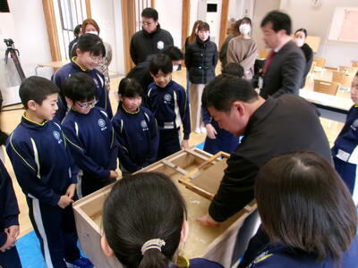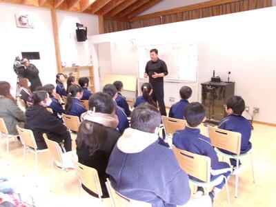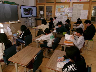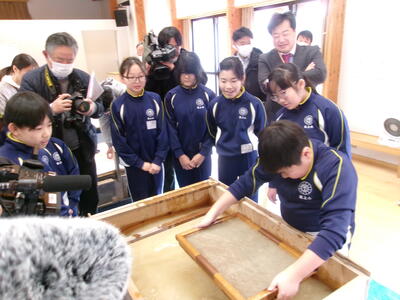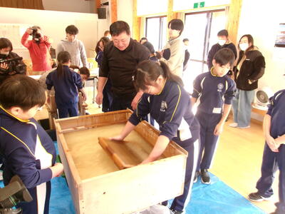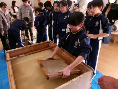 1月22日石川県輪島市の和紙職人遠見和之さんに来校していただき、自分たちの卒業証書用の紙すきを5年生が行いました。昨年の12月5日に自分たちで刈り取ったヨシを紙すきができるようにしてもらい当日を迎えました。すき方を近くで教えてもらいながら進め、無事終了することができました。北上地区内にある熊谷産業さんや、りあすの森さんの御協力により毎年行っています。