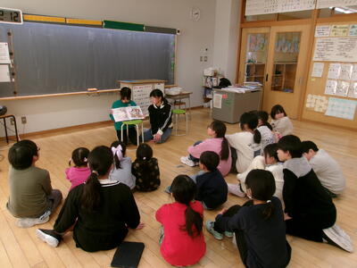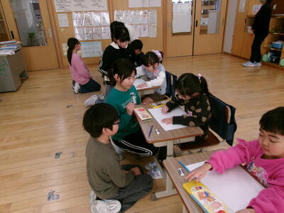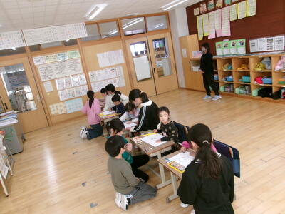 4日、来年入学予定園児の一日入学がありました。保護者が入学等の説明を受けている間、5年生の児童が園児と一緒に過ごしてくれました。この日のために、事前に一緒に遊んでいたため、園児の皆さんもあまり緊張することがなかったようです。
