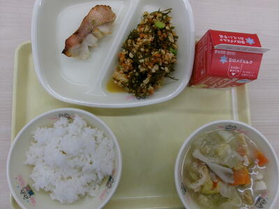 今日のメニューは、ごはん、牛乳、赤魚のねぎ塩焼き、昆布のそぼろ煮、野菜たっぷり味噌汁でした。魚に昆布、野菜(人参、大根、舞茸、白菜、長ねぎ等)が摂れて栄養たっぷりでした。