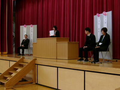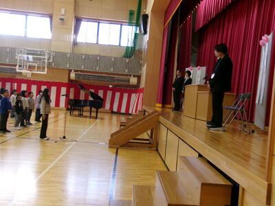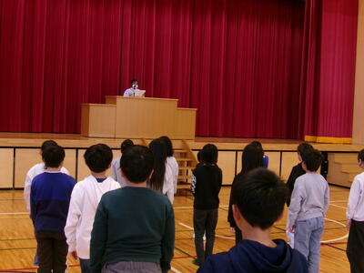 今年度の人事異動で、5名の職員が北上小学校から他校へと異動になりました。全校児童が見守る中で、お一人ずつ御挨拶をいただきました。いつまでもお元気でご活躍ください。