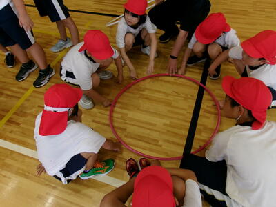 3、4年生がフラフープを使ったおもしろい授業をしていました。全員の指がフラフープに触れていることを約束として持ち上げ、リレーをするという内容です。最初は、なかなかうまくいきませんでしたが、話し合いを行い、互いに協力し合うことでうまくいったようです。
